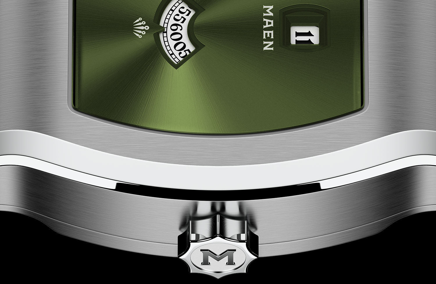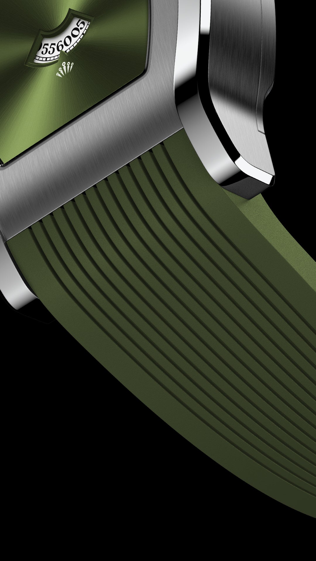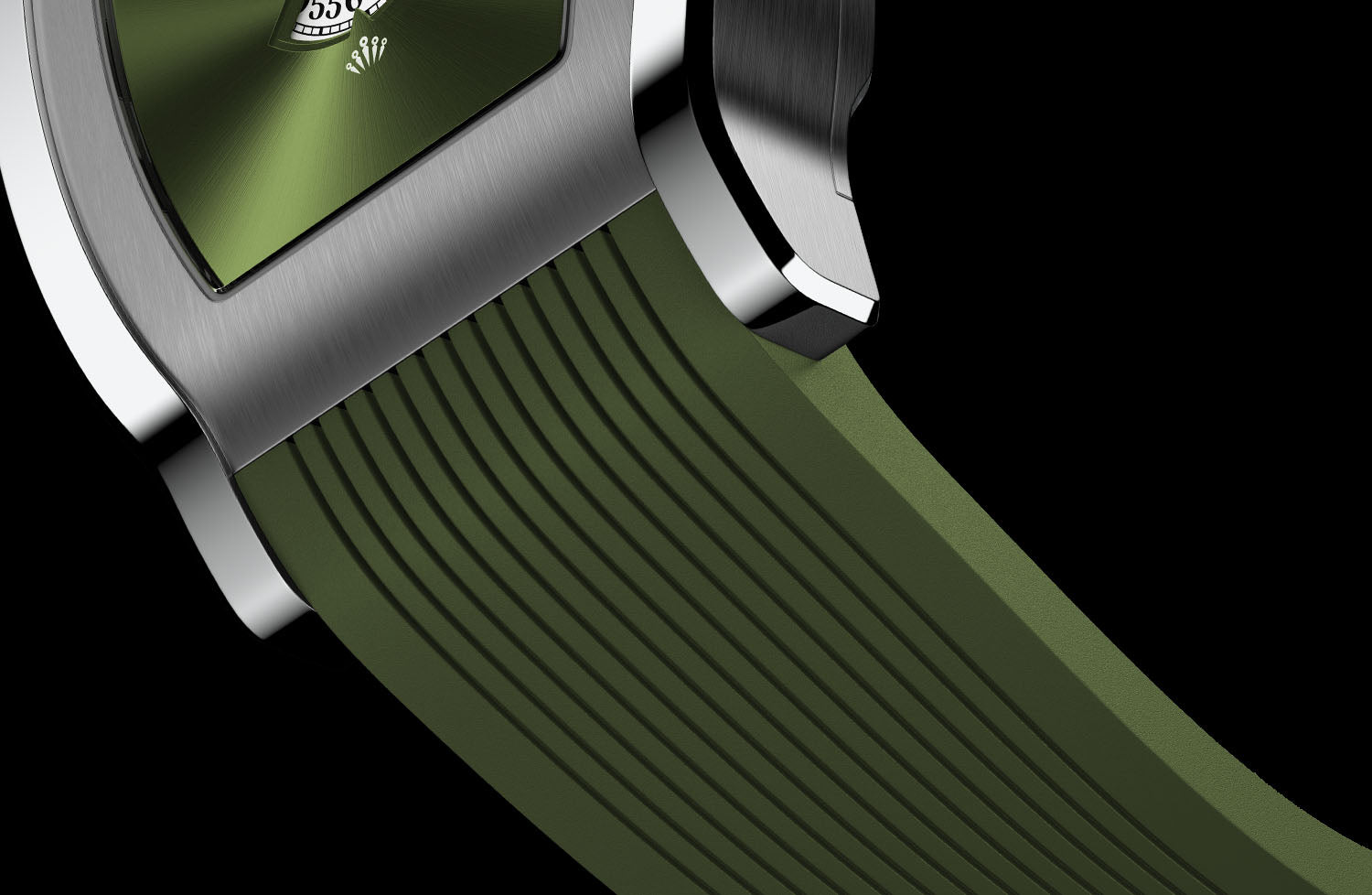 For the Grand Tonneau Jump Hour, we have designed a custom integrated FKM rubber strap that seamlessly follows the contours of the case, accentuating its striking angles. Crafted from premium FKM rubber, the strap offers exceptional durability and a comfortable fit.