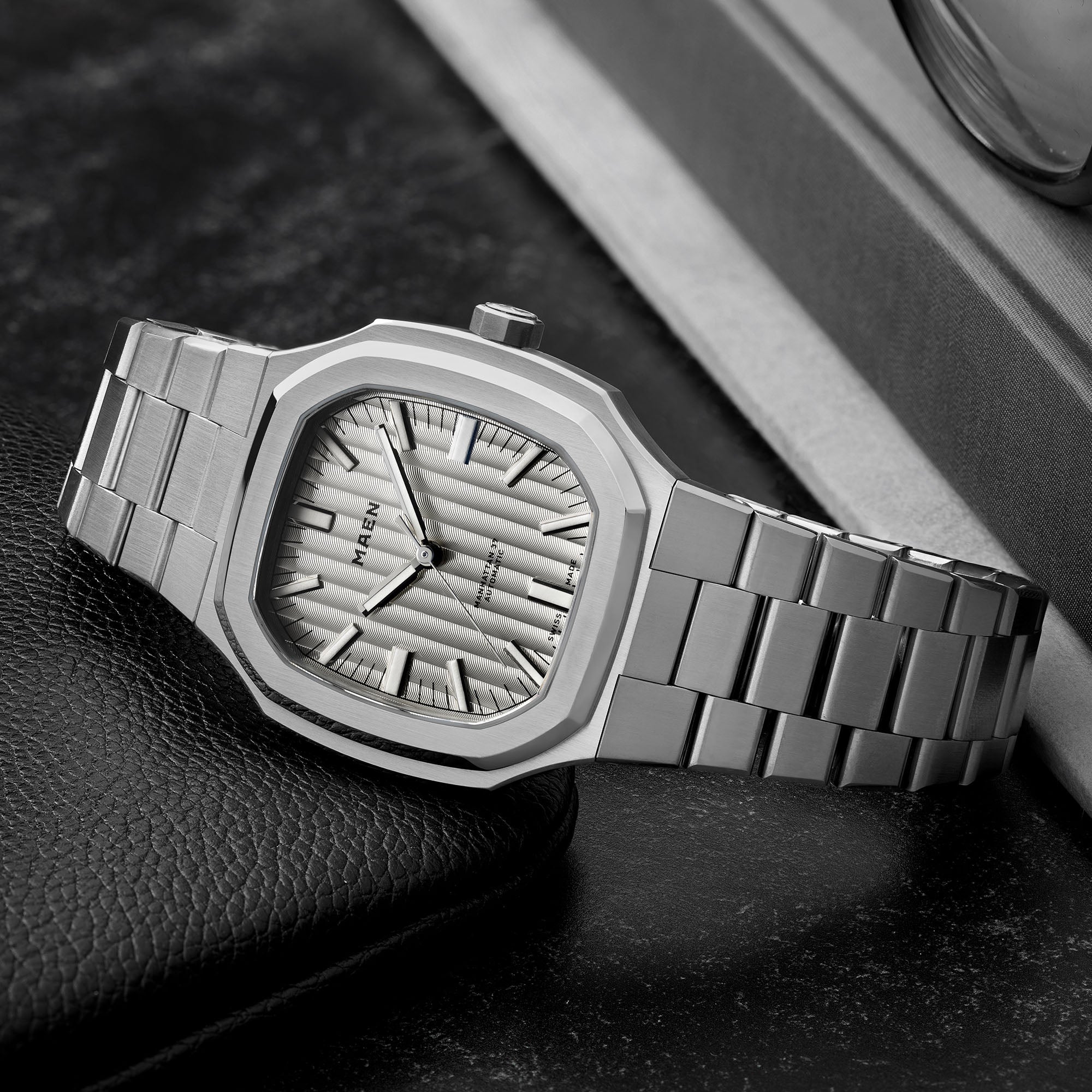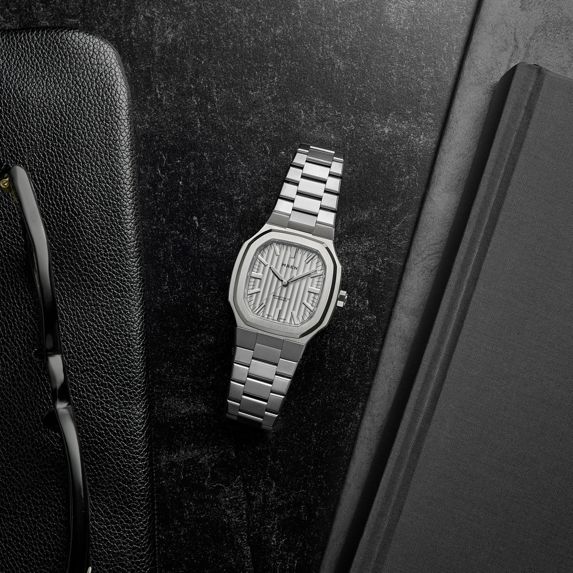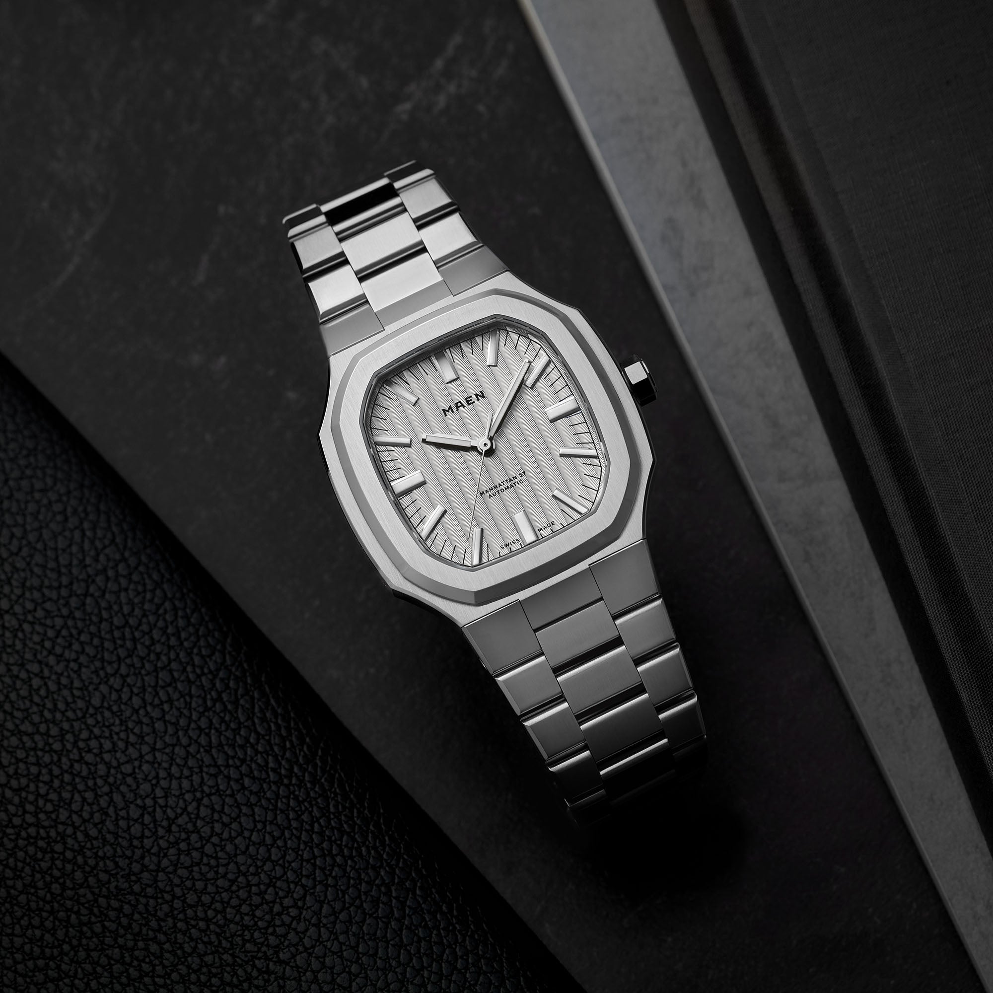 The Manhattan 37 has an unique vertically elongated Côtes de Genève dial that creates a spectrum of beautiful shimmers depending on the lighting.
