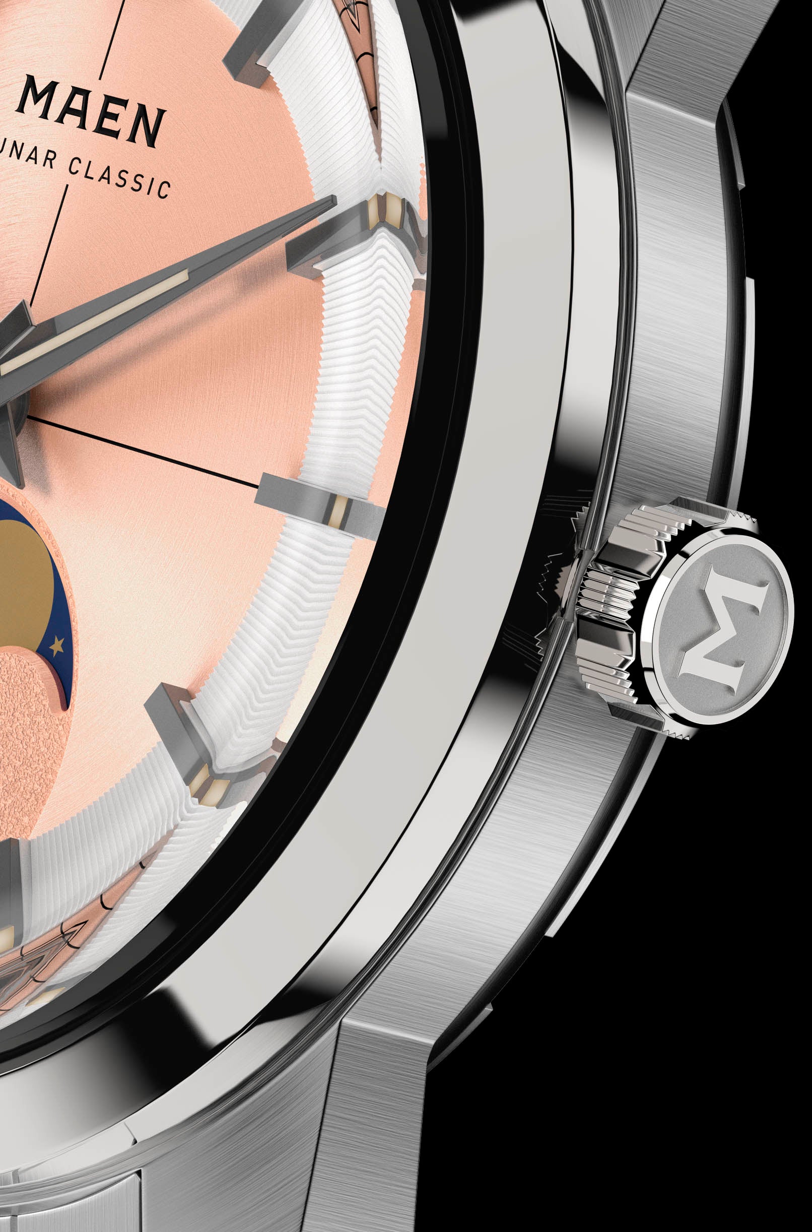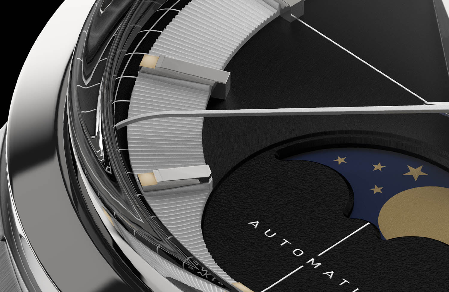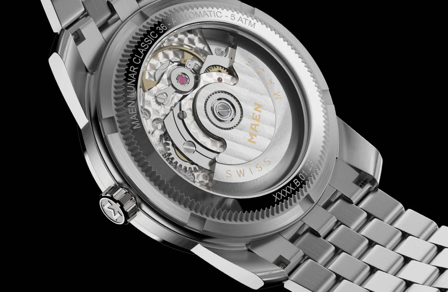 The Lunar Classic 36 is also available with Top Grade Sellita SW280-1 movement. The rhodium plated, fully decorated movement can be admired through the open caseback which is exclusively available in combination with this movement. The Top Grade movement is regulated in 5 positions and has a middle rate of 4 ±4 s/d.