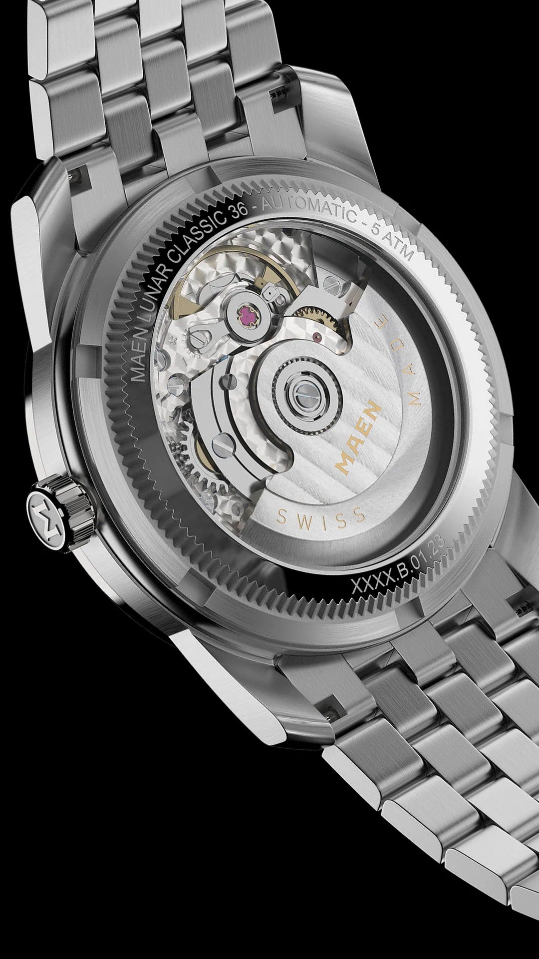 The Lunar Classic 36 is also available with Top Grade Sellita SW280-1 movement. The rhodium plated, fully decorated movement can be admired through the open caseback which is exclusively available in combination with this movement. The Top Grade movement is regulated in 5 positions and has a middle rate of 4 ±4 s/d.