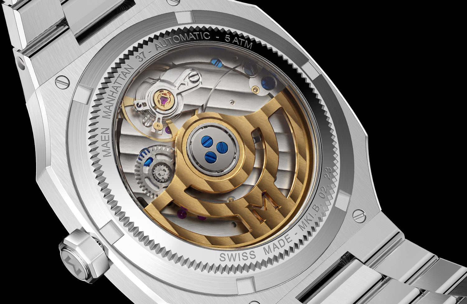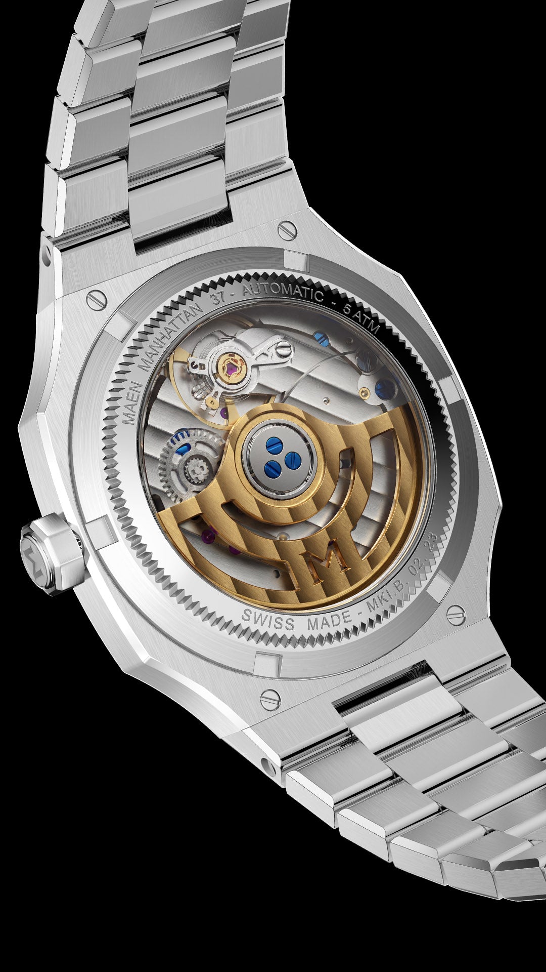 The Manhattan 37 is now also available with Top Grade La Joux-Perret G100 movement. The rhodium plated, fully decorated movement with blued screws and custom gold plated rotor can be admired through the open caseback which is exclusively available in combination with this movement.