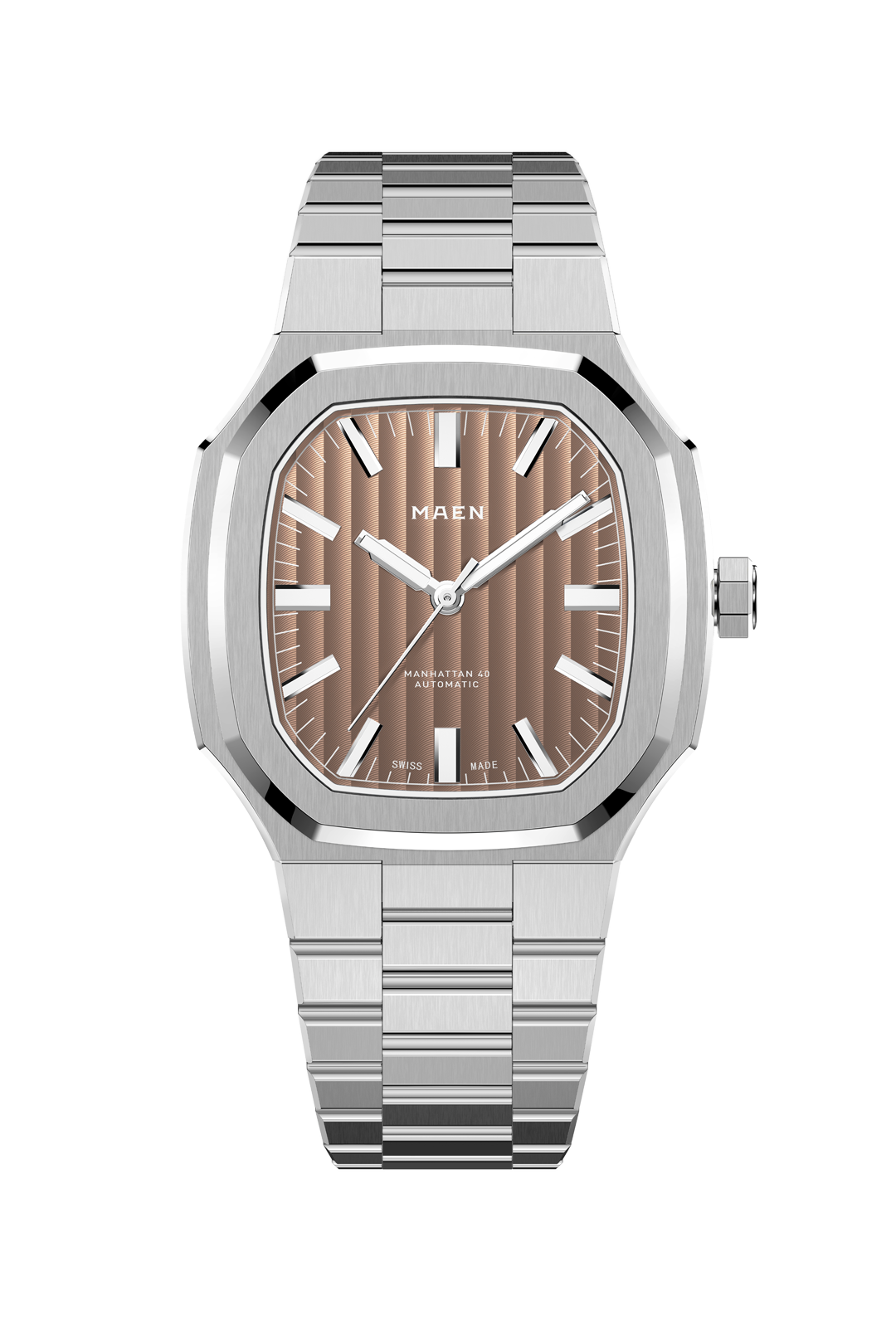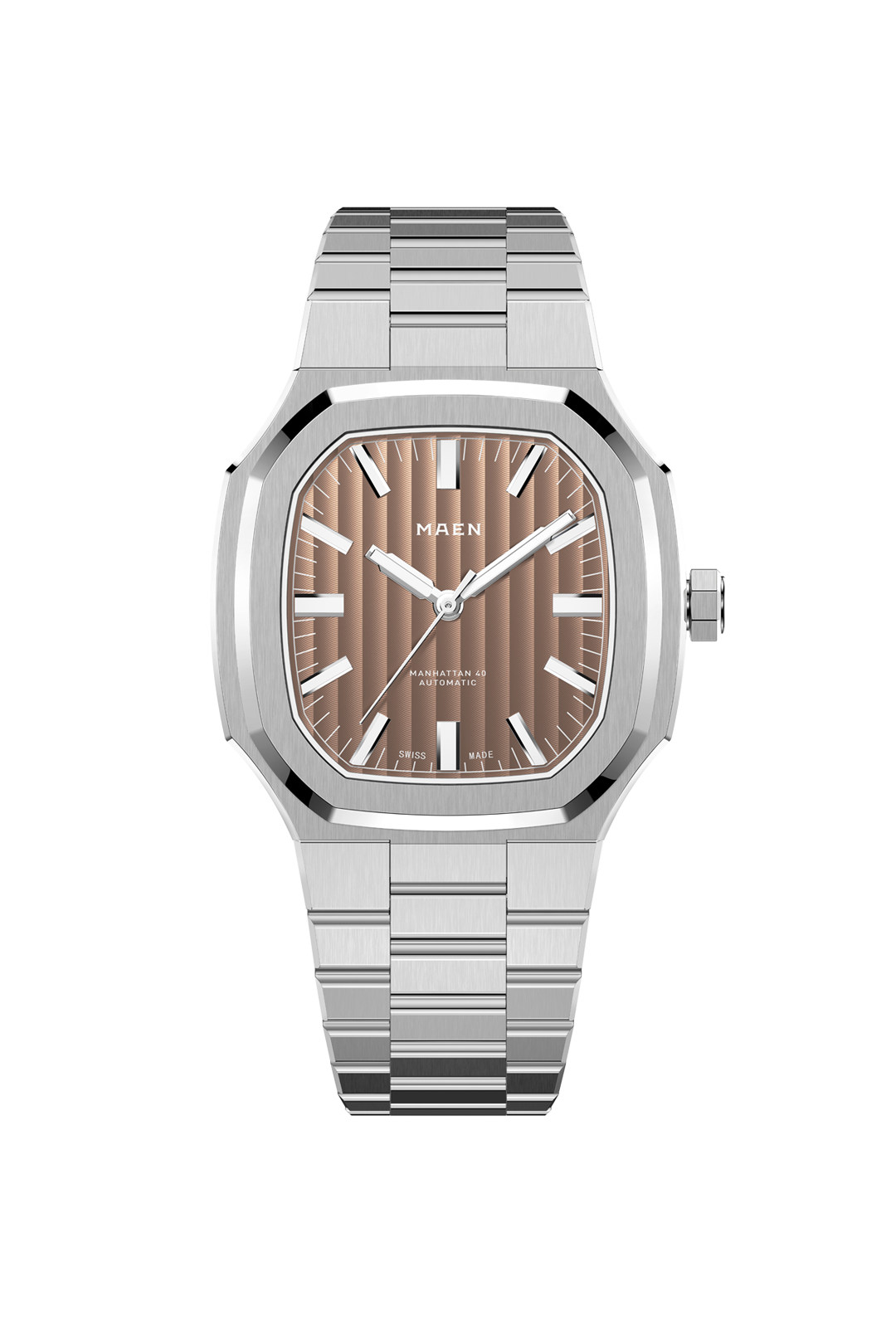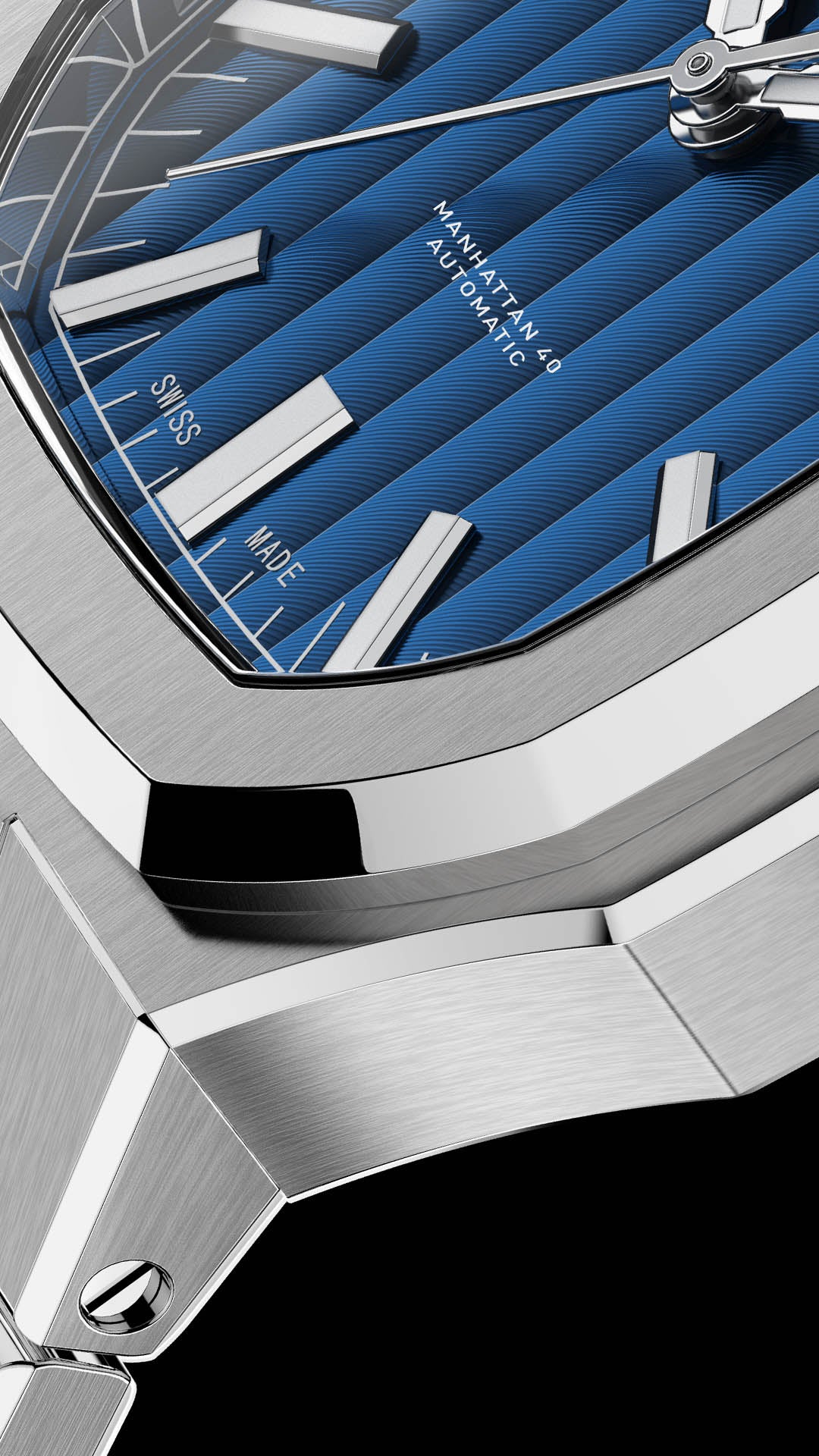 The Manhattan 40 has an unique vertically elongated Côtes de Genève dial that creates a spectrum of beautiful shimmers depending on the lighting.