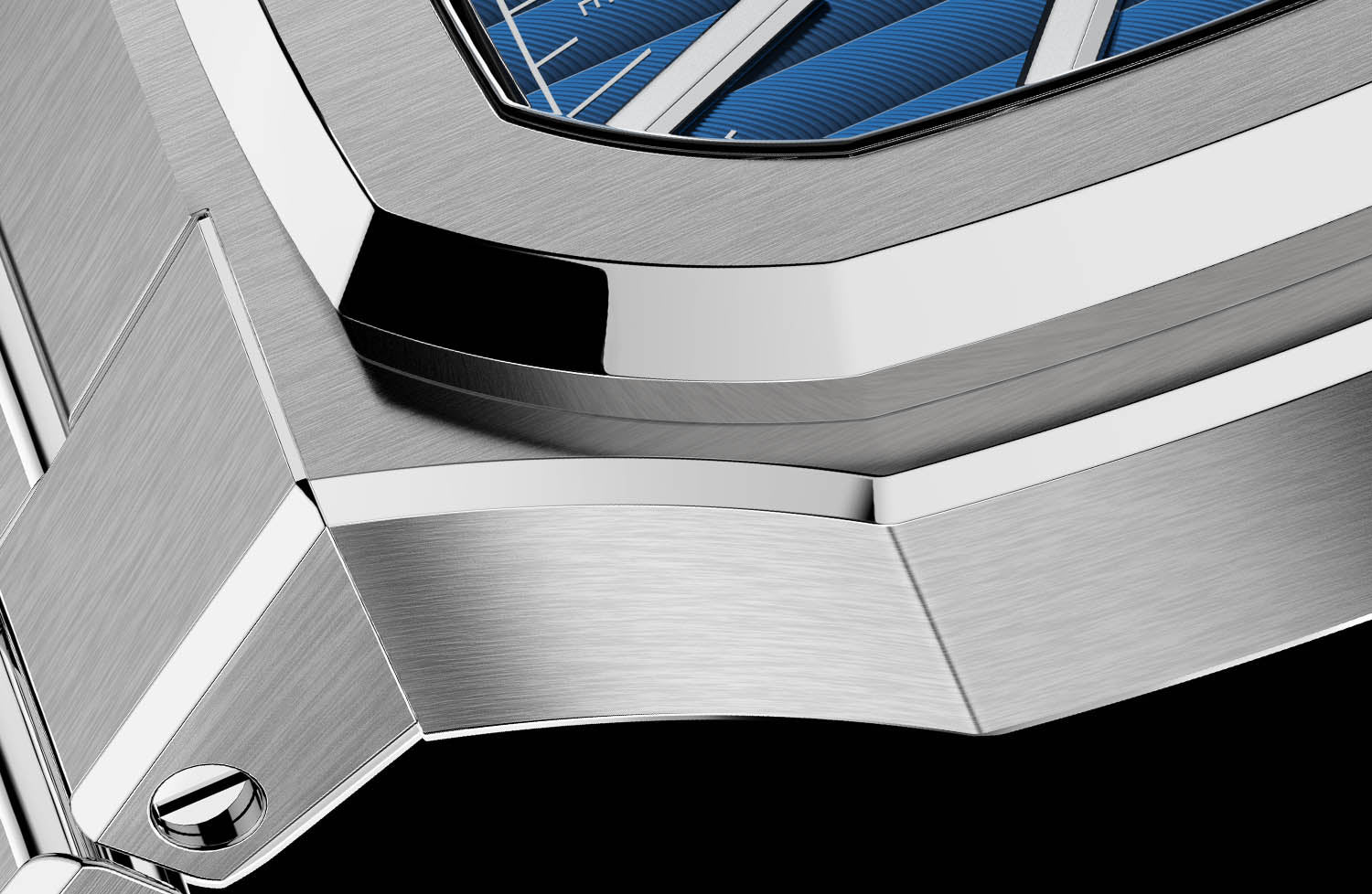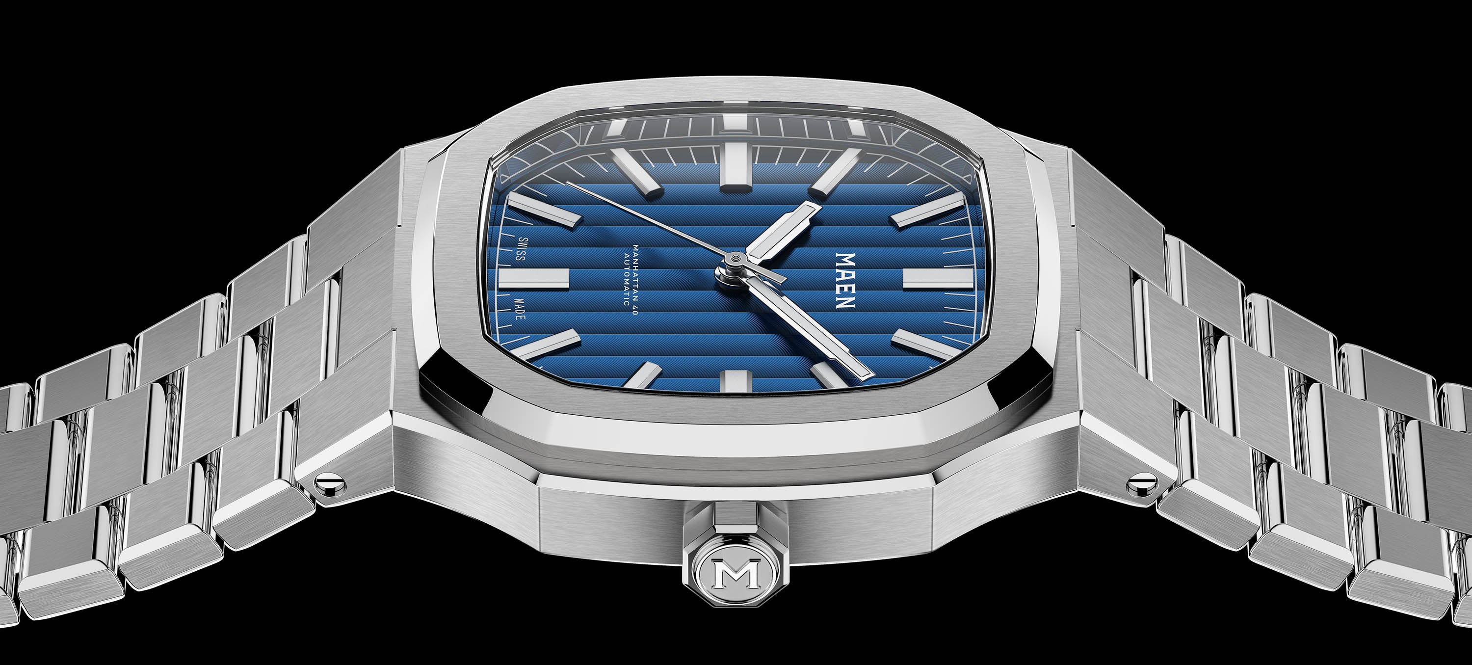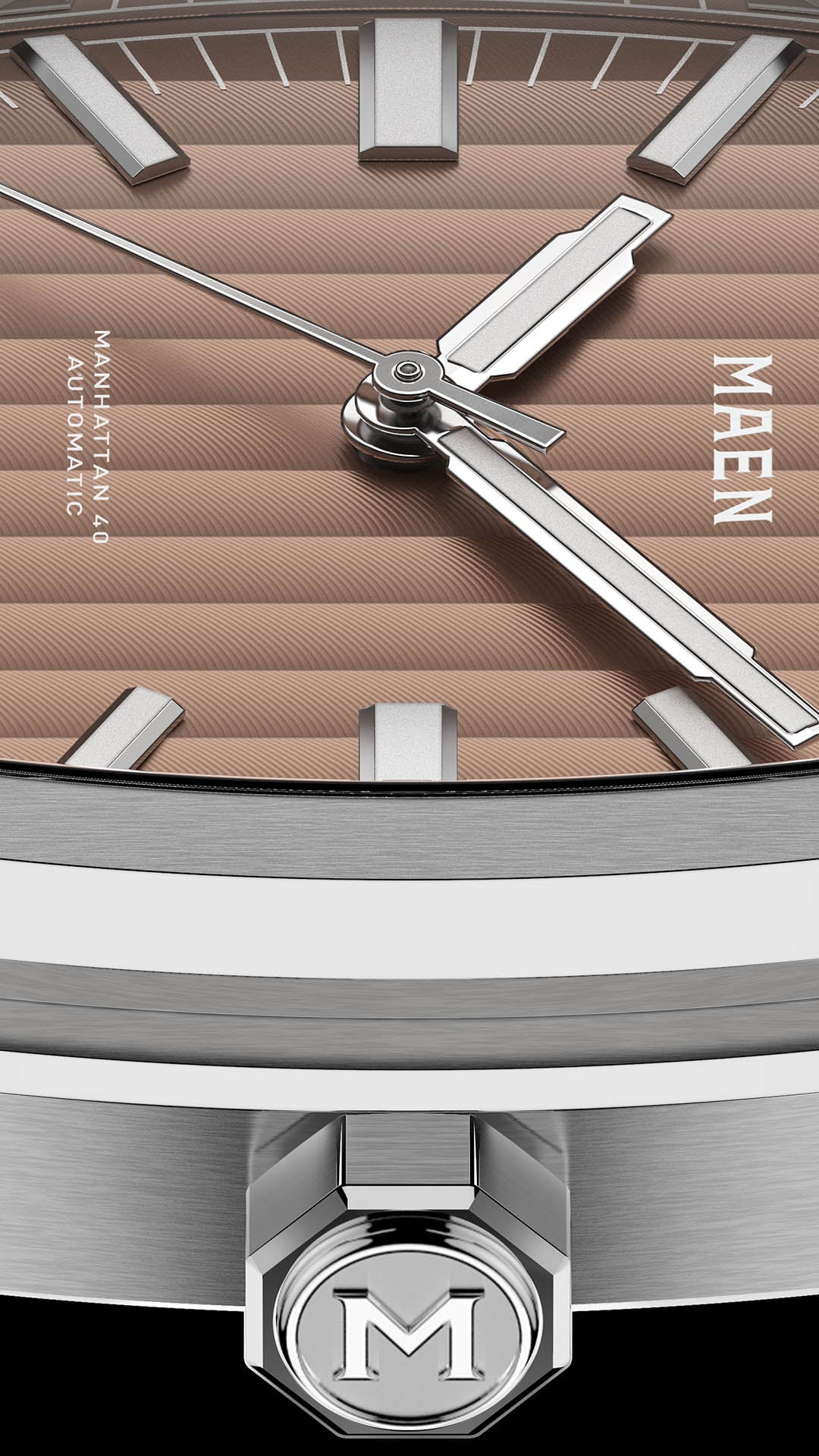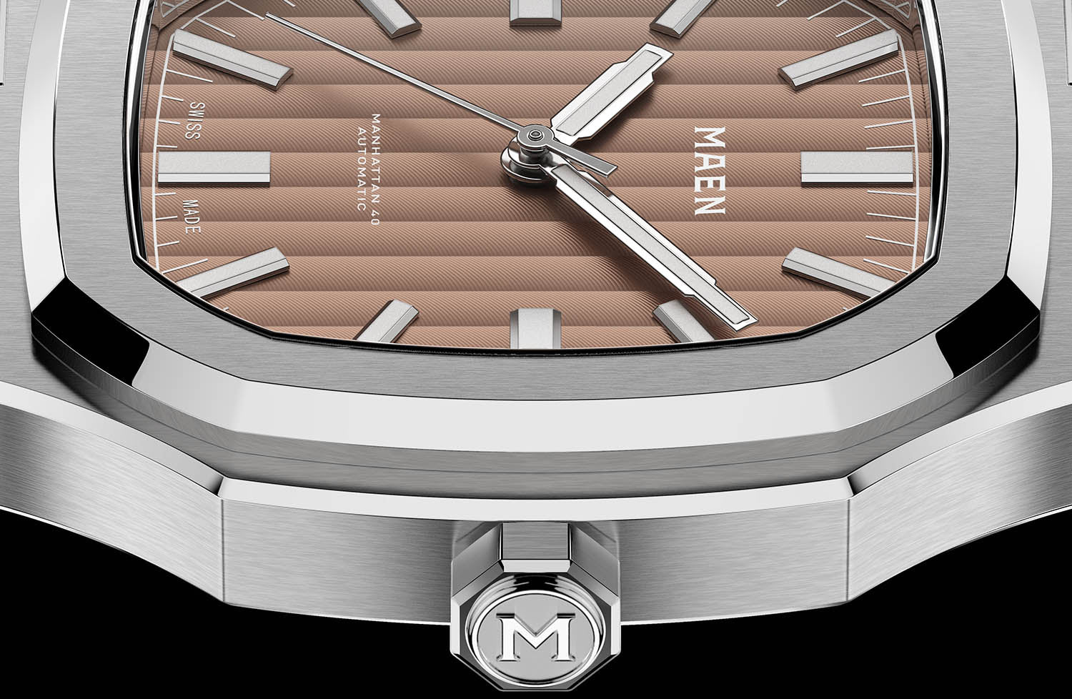 The Manhattan 40 has an unique vertically elongated Côtes de Genève dial that creates a spectrum of beautiful shimmers depending on the lighting.