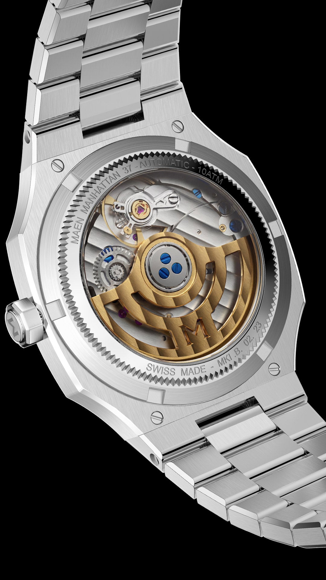 The Manhattan 37 is now also available with Top Grade La Joux-Perret G100 movement. The rhodium plated, fully decorated movement with blued screws and custom gold plated rotor can be admired through the open caseback which is exclusively available in combination with this movement.