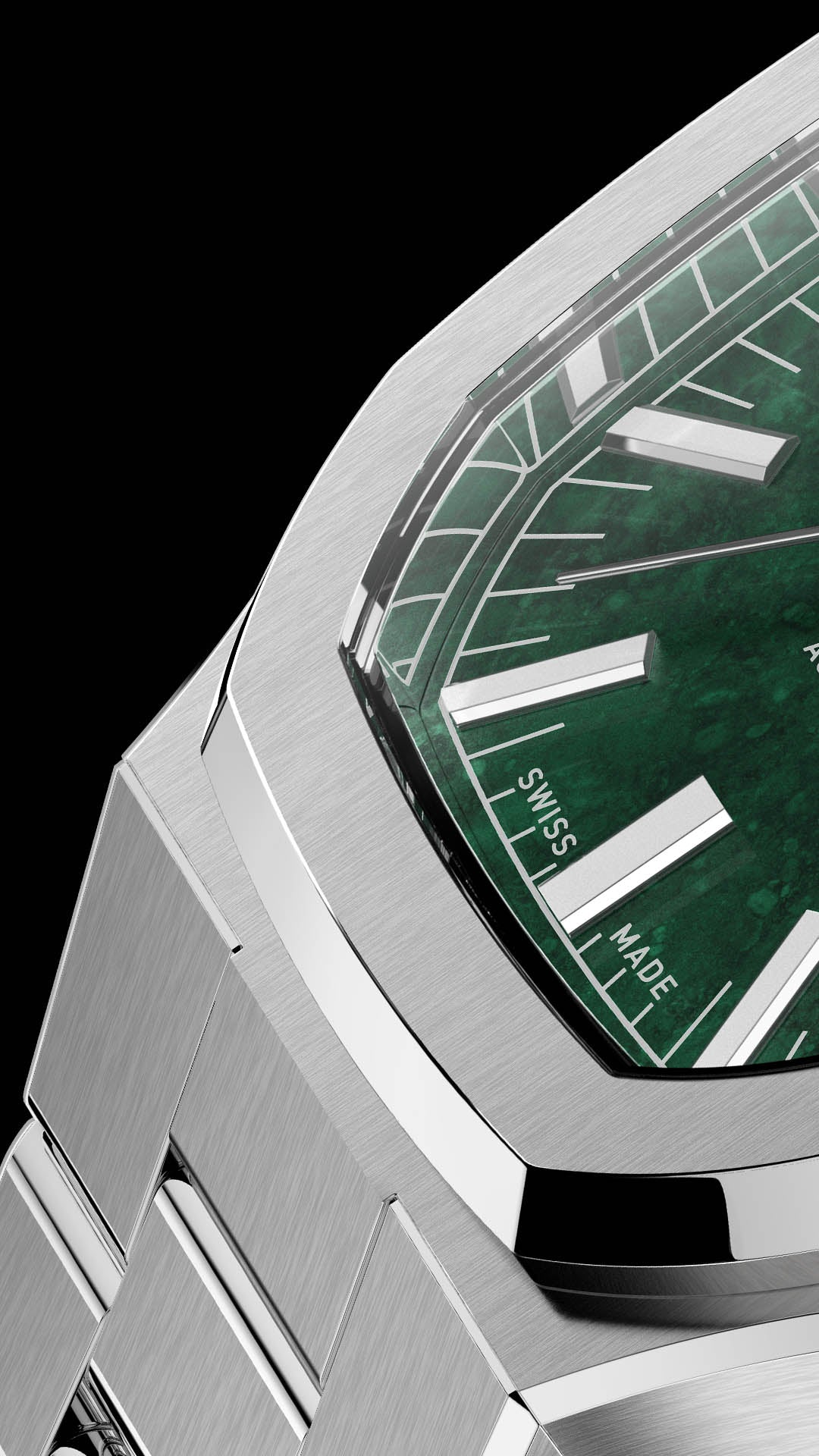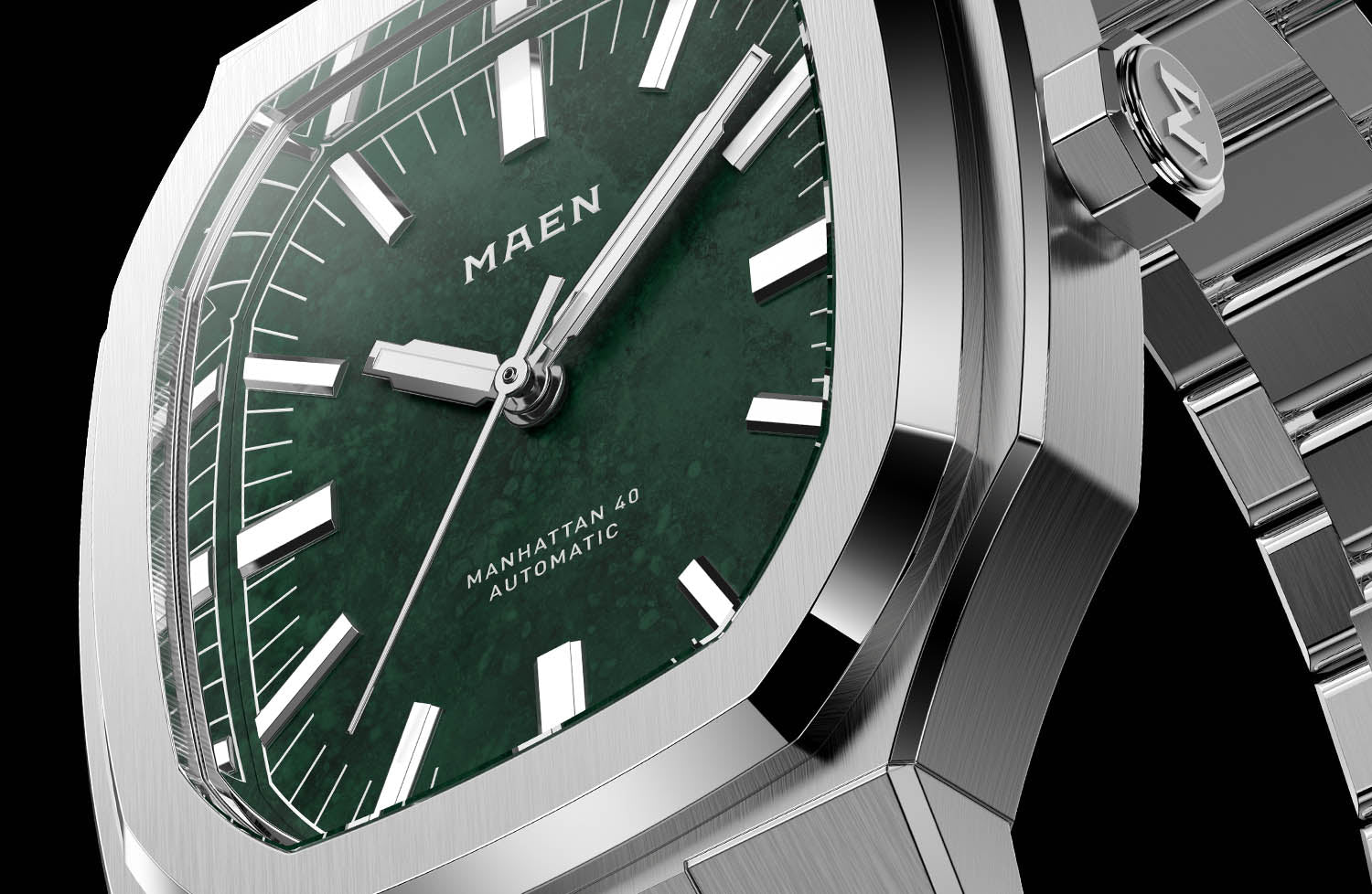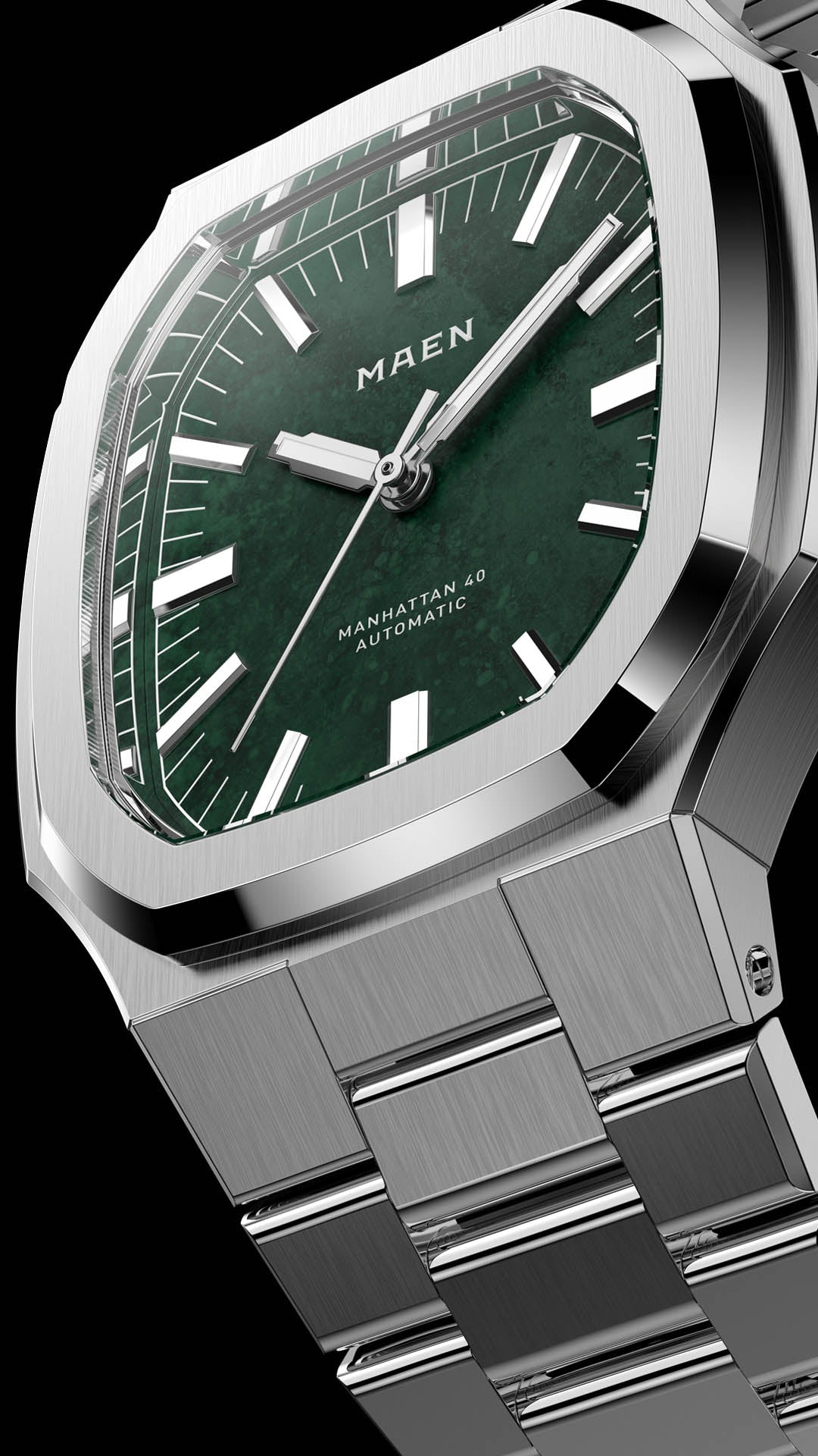 With its steel case, vertically elongated octagonal bezel, Green Jade Stone Dial and integrated bracelet, the Manhattan 40 packs a lot of punch.