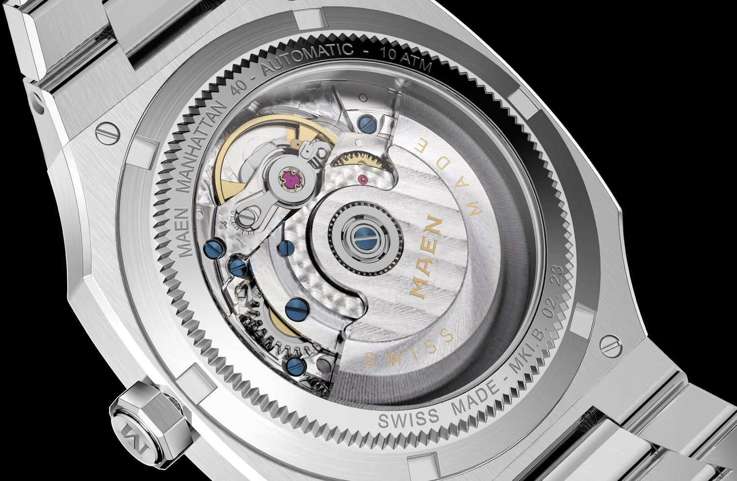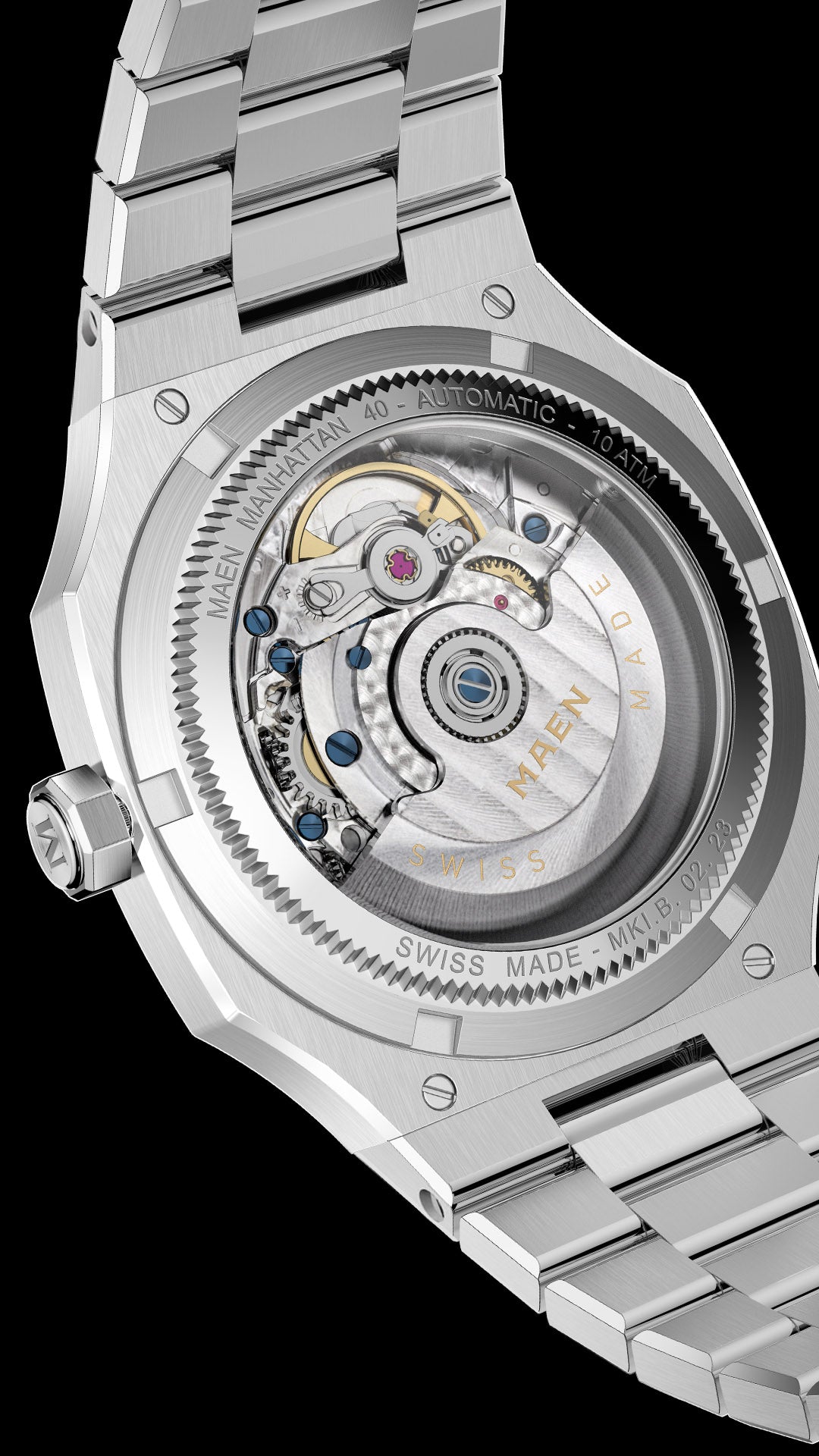 The Manhattan 40 is also available with Top Grade Sellita SW200-1 movement. The rhodium plated, fully decorated movement with blued screws can be admired through the open caseback which is exclusively available in combination with this movement.